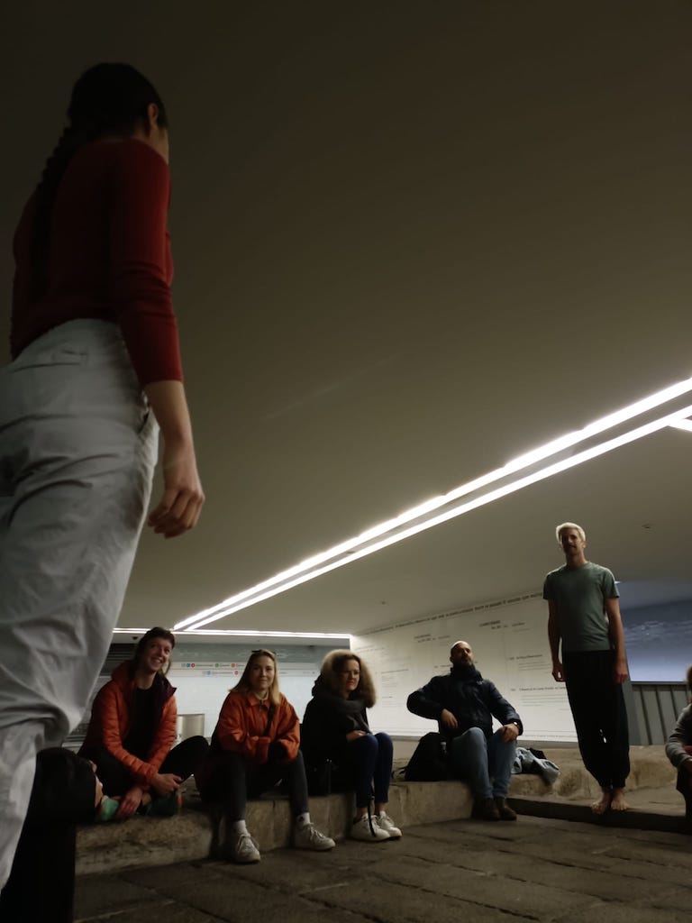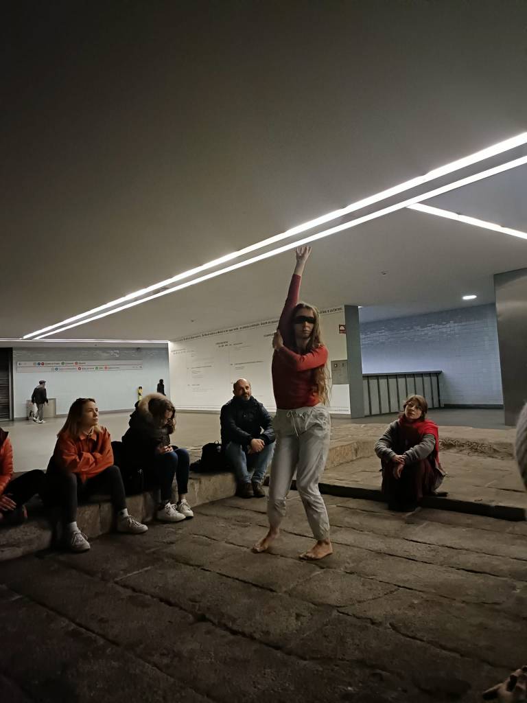 A performance about the authenticity of our feelings, performed at two different sites – a small room inside and a metro station in the middle of Porto. We created an intimate setting in which we invited the audience to share their thoughts and used our voice, movement and dance to interact.